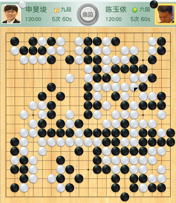 本轮比赛,率先破局取胜的是二台外援主将申旻埈。是局,申旻俊执白对阵三连胜的小将陈玉侬。黑棋开局冲击右下白棋急躁,白棋处理好后局面大幅领先。黑棋之后在左边与上边奋力拼搏,白棋冷静应对,轻松获胜。行棋204手。