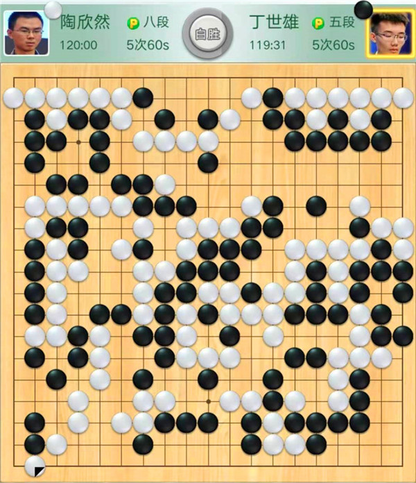 最后一局随即揭晓:陶欣然“锦上添花”,执白完胜丁世雄。布局时,白棋左边与右上获利。黑棋进攻右边白棋时候,白棋漂亮弃子抢占左下大棋优势扩大。之后白棋稳扎稳打直至终局获胜。