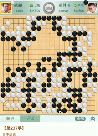 戎毅执白对阵蒋其润。开局白取地中央黑模样巨大,白浅消后黑棋攻击不当,被白活出两块棋后白棋领先。之后黑棋左下弃子围空又亏损,白棋以较大优势获得胜利。