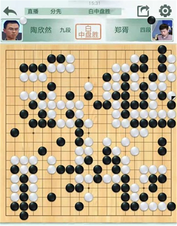 陶欣然执白对阵小将郑胥。黑棋开局在左边亏损,局面落后。最后黑棋在右边破釜沉舟寻求战机,白棋计算精准,将黑全杀,白中盘胜。