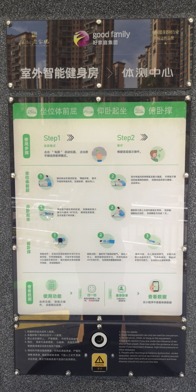 研发该套设备的深圳企业好家庭事业有限公司负责人张佳华表示,“此次被调研的室外智能健身设施已经升级至4.0版本。基于物联网、5G与大数据系统,这套智能化设施拥有人脸识别、无感采集健身数据、手机扫码可一键获取专属运动处方的功能,可为市民提供个性化、多元化、科学化的健身服务。”