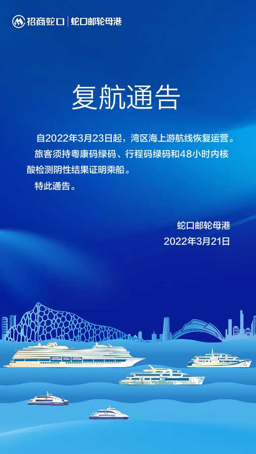 读特客户端 ·深圳新闻网2022年3月21日讯(记者 田志强)记者从招商蛇口邮轮母港获悉,自3月23日起,湾区海上游航线恢复运营。搭乘该航线的旅客须持粤康码绿码、行程码绿码和48小时内核酸检测阴性结果证明乘船。