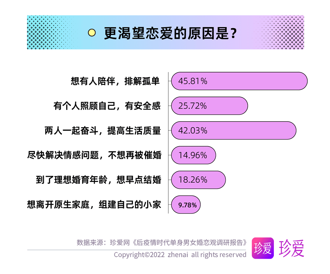 当下,人们的社交需求日益多元化,这对专业婚恋服务提出了更高的要求。珍爱网将持续关注单身人群的交友偏好和婚恋观念,升级产品,提升服务,帮助不同年龄、不同性格、观点各异的单身人群找到适合的另一半,早日收获幸福。