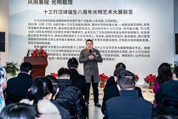 近日,国家社科基金项目“当代汉诗创新诗体研究”阶段性成果展——十三行汉诗书画作品展,于光明区文化馆成功举办。本次展览集中展示本项目重要研究成果、全国各地新汉诗诗人的原创十三行汉诗之书画作品等。十三行汉诗创立八年以来,得到了海内外诗人的广泛关注,在国家社科基金研究团队精研阐释的基础上,得到了学术界的 ...