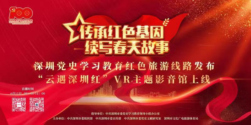 6月11日,“传承红色基因续写春天故事”深圳党史学习教育红色旅游线路发布暨“云遇深圳红”VR主题影音馆上线仪式,将在深圳当代艺术与城市规划馆举办,将发布6条红色旅游线路,共30个景点,由中央广播电视总台央广网、央视网将对仪式及六条旅游线路的红色大巴领游进行直播,每个景点都有一个生动的历史故事,让党 ...