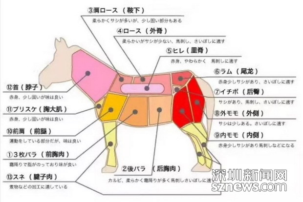 马能做成刺身的部位相当的有限,依照油花分布大致可以分为腹肉(卜口)、霜降、赤身等不同的等级。其中最稀有的的“三枚腹”肉,一匹五百公斤的马只能产出大约5-6公斤,肉质口感近似于蓝鳍金枪鱼中腹肉。