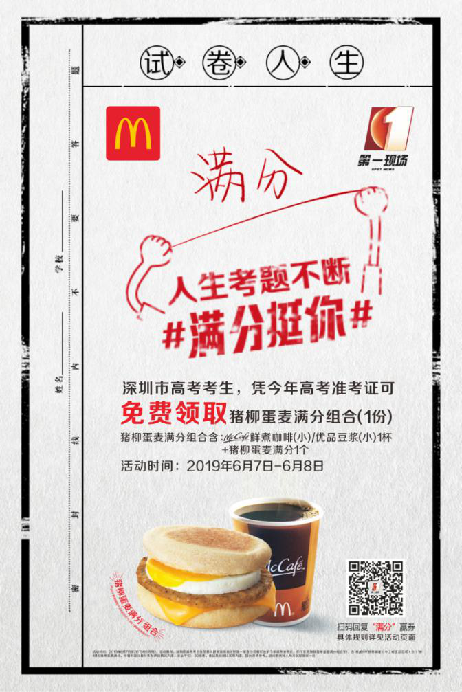 麦当劳早餐携手百万网友,预祝高考考生“满分”考试,以“满分”的早餐,迎接每天“满分”生活。