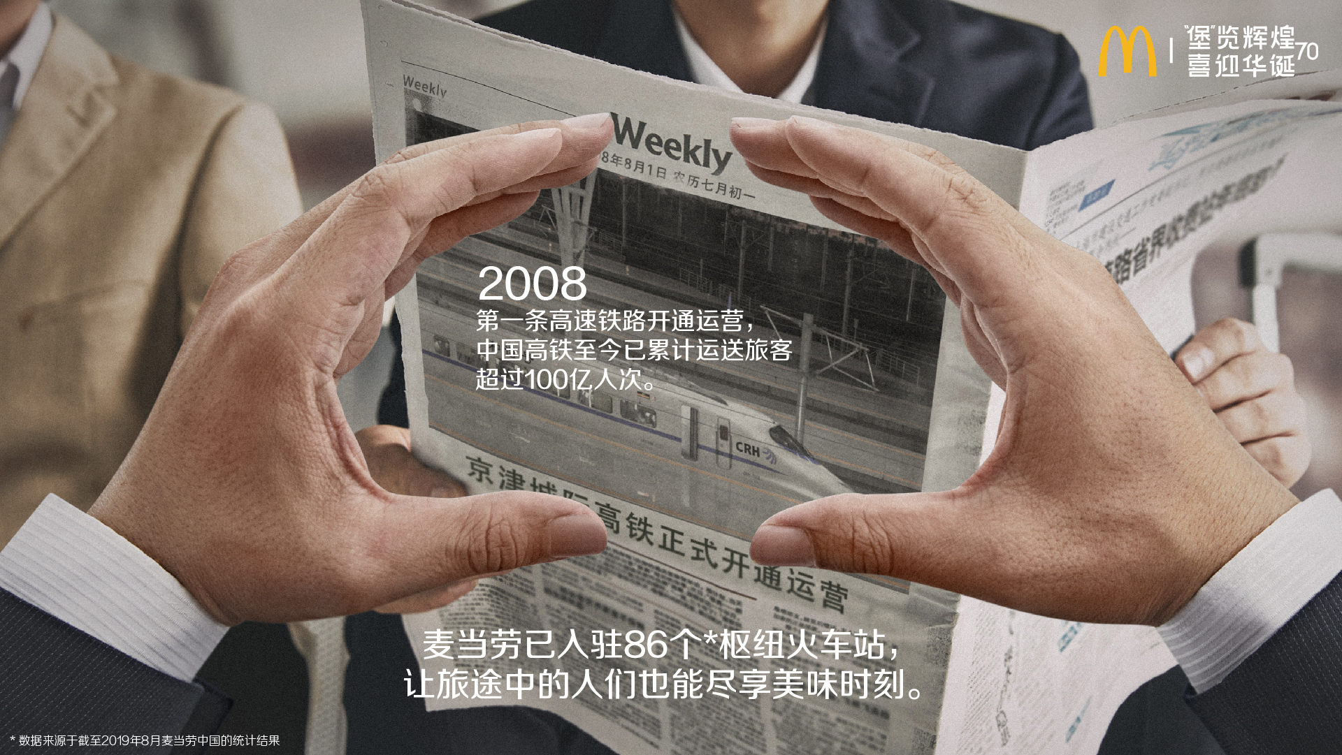 便捷出行,美味随心:2008年,中国第一条高速铁路——京津城际铁路正式开通。高铁不仅改变了人们的出行方式,更推动了区域经济发展。麦当劳已入驻86个枢纽火车站,为旅客提供便捷美味。