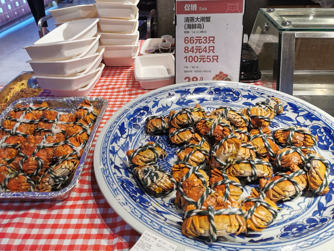 其中爆款非大闸蟹莫属。民间有个讲究:“九雌十雄”,农历九月吃母的大闸蟹,农历十月吃公的,因为那时候大闸蟹的蟹黄和蟹膏是最好的。黄金周期间,盒马深圳大闸蟹销量与9月相比增长六倍。其中最受欢迎的是2两重的母蟹,盒马皇庭广场店假期里试过一天卖出近两千只大闸蟹。