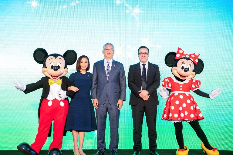 麦当劳中国董事会主席张懿宸先生(中)、麦当劳中国首席执行官张家茵女士(左二)、迪士尼中国影业及品牌管理副总裁及总经理徐隆立先生(右二)、米奇和米妮(左一及右一),共同见证合作