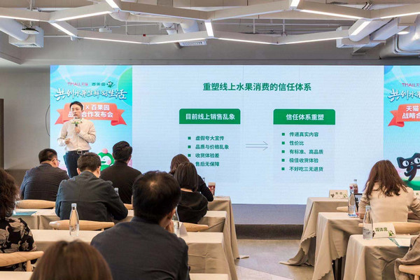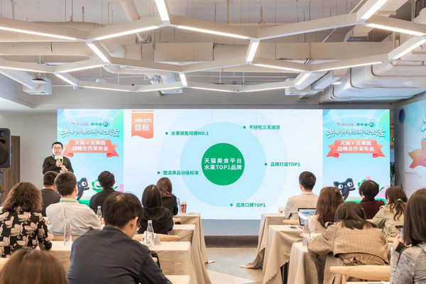 见圳客户端·深圳新闻网2019年11月30日讯 11月29日,天猫与百果园在深圳阿里中心举行战略合作发布会,天猫大食品总经理无龄、大食品果蔬冰运营负责人思豪,百果园集团副总裁焦岳、电商负责人孙鹏出席会议并发表演讲。本次发布会以“共创水果生鲜好生活”为主题,双方计划通过优势互补和资源整合,从水果到生鲜进行全面深入的战略合作。