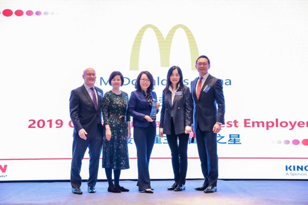 麦当劳中国首席人员官王艳伟(中 )代表公司接受2019“怡安中国最佳雇主”称号