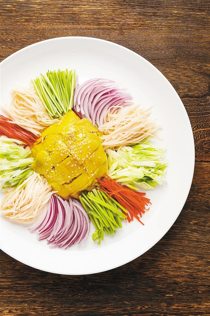 “捞”在粤语中有工作有钱赚的意思,祝愿来年风生水起。徐师傅采用远近驰名的葵花鸡。葵花鸡顾名思义,由新鲜的葵花盘、叶、杆等炮制而成的饲料喂养,以葵花杆榨成的汁解渴,是十足的“鸡中贵族”。徐师傅选用讲究的鸡肉来准备这道讲究的菜,寓意前来用餐的宾客在来年可以步步高升、事事顺利。将葵花鸡、子姜丝、洋葱丝、香菜段等各式新鲜食材捞到一起,齐齐起筷,高呼:“齐齐捞起,捞到风生水起!”