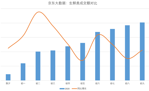 今年春节,线上生鲜品类的需求量大幅增长。京东大数据显示,整个春节期间,京东生鲜成交额同比增长215%,为消费者提供了近1.5万吨生鲜产品,蔬菜成交额同比增长近450%。在京东到家平台上,除夕至大年初九,粮油副食商品销售额同比去年春节增长736.40%,肉品同比增长711.11%,休闲食品增长527.16%,蔬菜增长441.1%,水果增长378.8%,米面粮油、肉禽蛋奶、蔬菜水果和水饺馄饨等速冻食品均十分畅销。