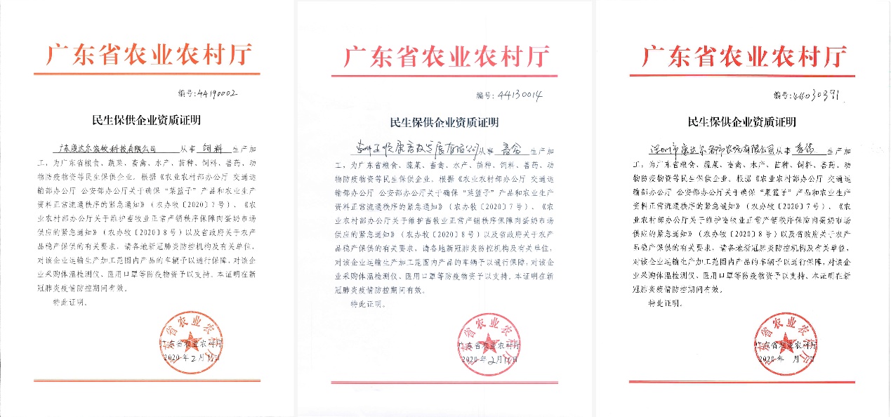 见圳客户端·深圳新闻网2020年2月13日讯 农产品是群众生活必需品,农业生产资料是农业生产的必需物资。2020年2月11日-12日,康达尔集团农业板块三大公司广东康达尔农牧科技有限公司、惠州正顺康畜牧发展有限公司、深圳市康达尔都市农场有限公司先后获批“民生保供企业”资质证明,这将非常有利于各企业开展农产品和农业生产资料的保供工作,也意味着康达尔集团在这场防疫保供攻坚战中所发挥的作用获得了高度的肯定。