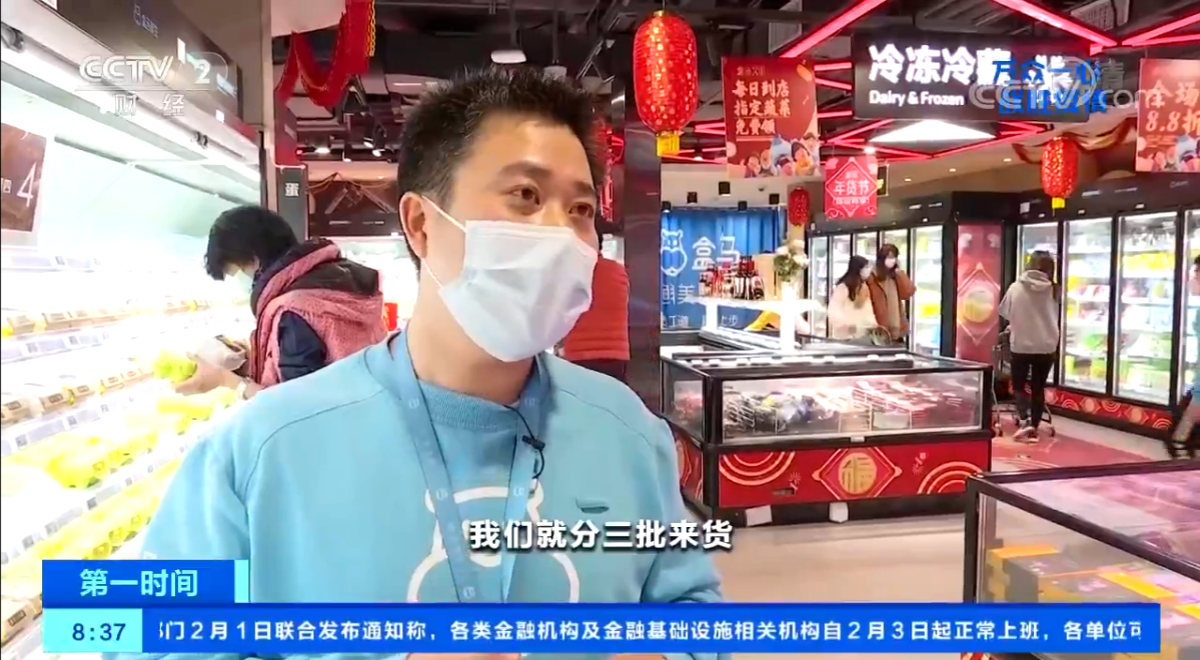 在政府持续保障货源供应的背景下,钟天平所在的超市加大了批发市场进货的频次,到了初六,供应状况已经恢复正常。“像蔬菜的销量是平常十倍左右,分三批来货,我们每天要补充三次货架,早上一次、中午一次、晚上来一次。”