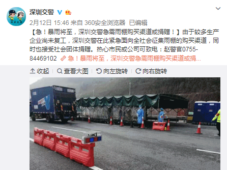 见圳客户端·深圳新闻网2020年2月14日讯 2月12日下午约4时,深圳交警官方微博的一条消息牵动了深圳红牛负责人张健明的心。该微博写道:“急!暴雨将至,由于较多生产企业尚未复工,深圳交警在此紧急面向全社会征集雨棚的购买渠道,同时也接受社会团体捐赠。”