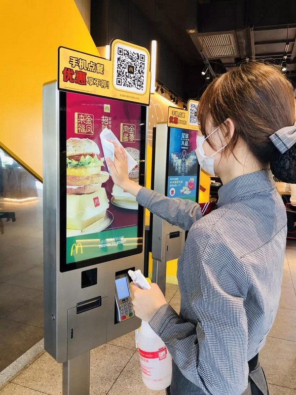 目前全国所有的麦当劳餐厅启动上班员工测温流程,并提高员工洗手消毒频次,全国餐厅全员佩戴口罩。在餐厅为顾客提供免洗洗手液,对所有餐厅的通风系统和顾客常接触的设施,强化消毒并增加频次,包括大门把手、自助点餐屏、楼梯扶手、柜台台面、取餐区、桌椅、餐盘、儿童椅、儿童乐园等。