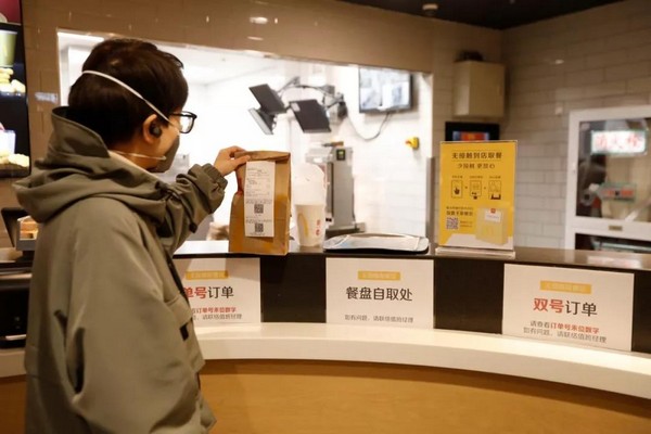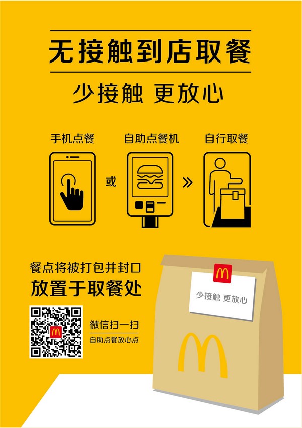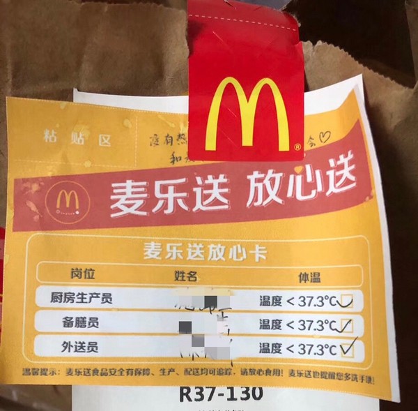 为了让顾客放心,麦当劳在安全服务的前提下,餐厅实施“无接触配送”和“无接触到店取餐”。所有外送订单均附上“麦乐送放心卡”,标注生产、配膳、外送人员姓名及体温,做到餐品、人员可追踪。顾客可选择让外送员将餐品送到指定位置取餐,在手机、餐厅自助点餐机或柜台点餐后,无论堂食或外带,员工都会将制作好的餐点装入打包袋并封口,放置到取餐处。
