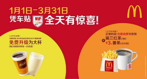 开车取餐少接触,麦当劳“得来速”餐厅让驾车的顾客购餐更方便、安全且快速。驾车者不用下车,在餐厅车道的窗口即可完成点餐、付款和取餐。现在免费领取 VIP车贴享福利,3月31日前,早餐时段购买小杯优品豆浆或鲜煮咖啡可免费升杯;正餐时段任意消费即赠锡兰红茶,或者加3元换一份小薯条。(常军平)
