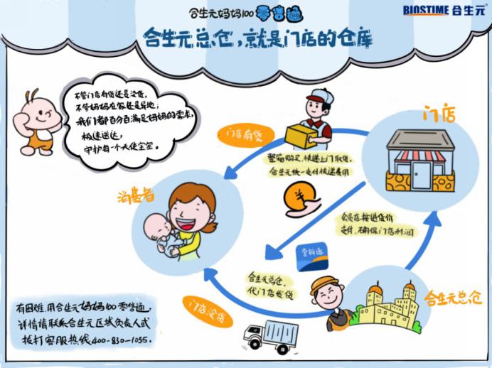 顾客因道路封闭等原因在老家,需要奶粉,和原来常住地的母婴门店老板下单。如果原来母婴门店无法寄送产品到异地的消费者,母婴门店老板把需求报给合生元妈妈100零售通,合生元从自己的总仓出货快递,利润还计入原来门店的账上。