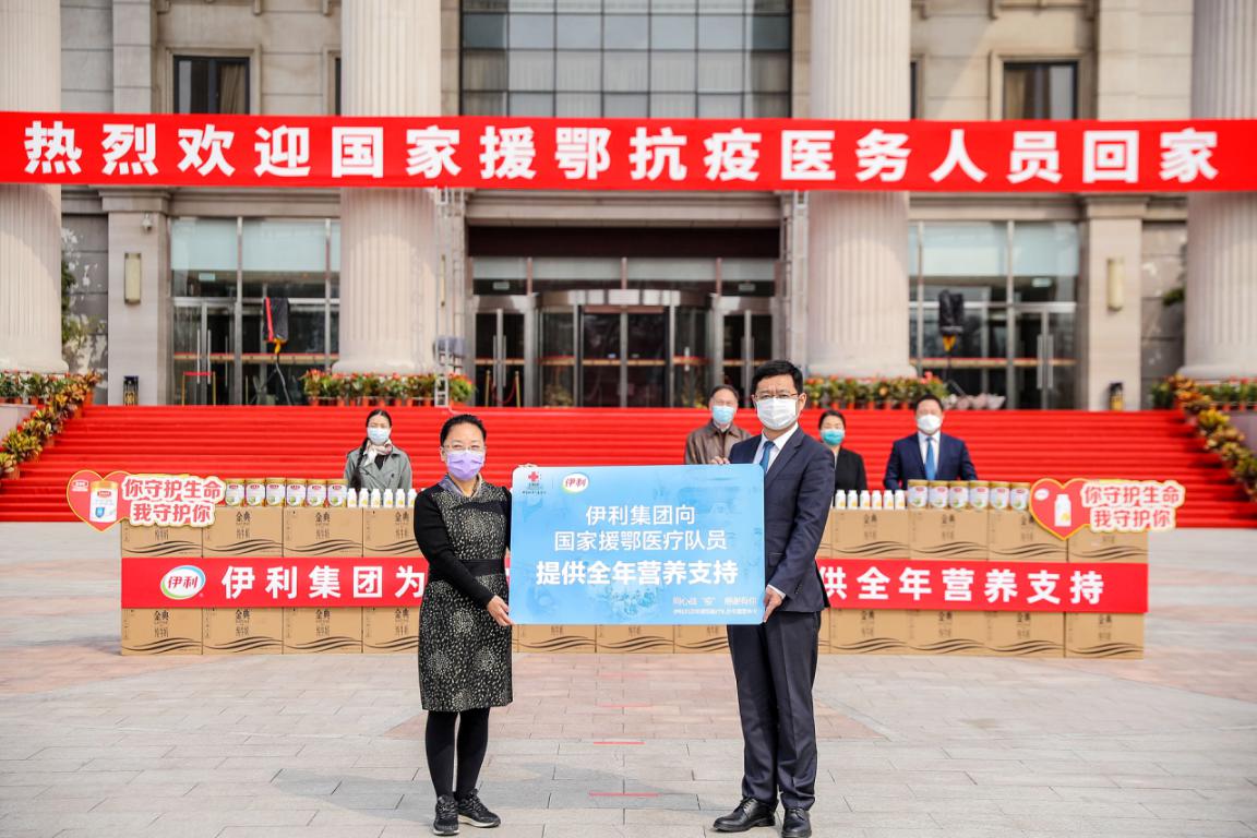 作为健康领域的龙头企业,伊利一直为抗疫提供支持。3月31日,伊利联合国家卫健委第一时间向全国所有援鄂医疗队员提供全年营养支持,用爱心和营养持续守护一线抗疫医疗队员的健康。这既是疫情爆发后,伊利为一线抗疫群体送去营养关爱的延伸,也将是队员们回到工作岗位后,伊利迎接他们的一声声暖心问候。国家卫生健康委食品安全标准与监测评估司一级巡视员张磊时表示肯定和赞赏:“伊利为疫情防控工作做出了重要贡献,此次伊利第一时间为凯旋归来的国家援鄂医疗队提供全年营养支持,用爱心和营养持续守护队员们的健康,这一切都让我们看到了龙头企业的社会责任与担当。”