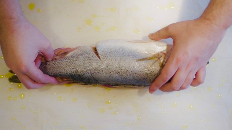 5、185℃预热烤炉后,将鲈鱼放入烤箱中烤制45分钟;