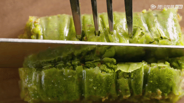 奶酪加满满的开心果碎,上下覆盖二十层薄如蝉翼的面皮,小伙子苦苦练习七年擀面皮,十几张面皮同时擀压,每张的厚度不超过0.1毫米,