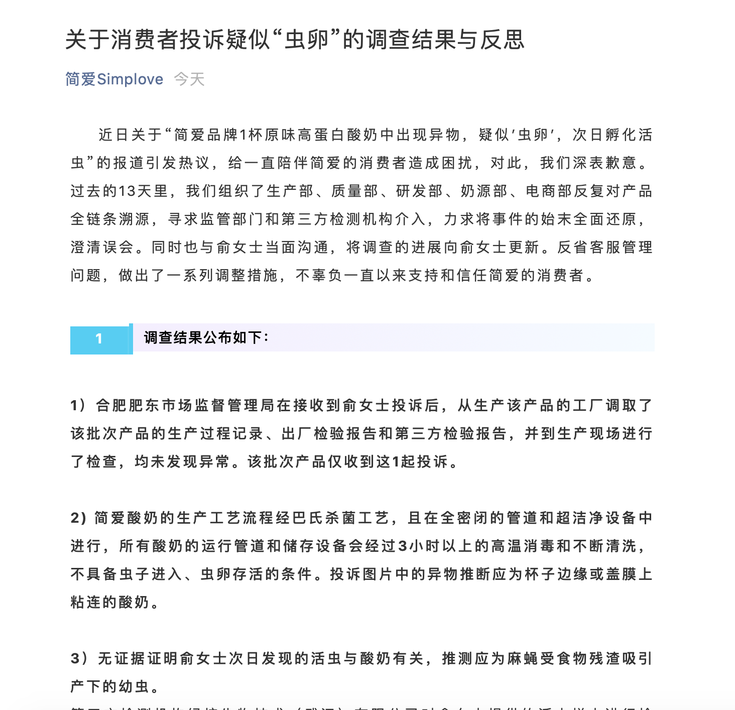 关于“简爱品牌1杯原味高蛋白酸奶中出现异物,疑似’虫卵’,次日孵化活虫”的事件,今天有了最新进展,简爱在其官方微信公众号上发布了调查报告,并做出反思。
