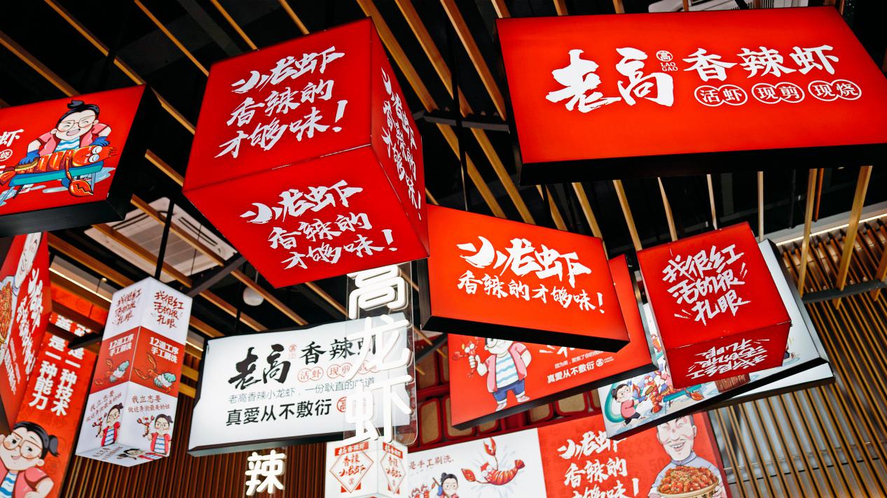“恋爱是一种能力,吃虾是一种技术,我能力有限,技术却很高”;“真爱绝不敷衍”……老高香辣虾深圳旗舰店的装修风格有了较大创新,以红色为主色调,店里都是老板的Q版人物形象,还有萌萌哒的灯牌和超酷的打卡墙,超级适合朋友聚会、拍照。