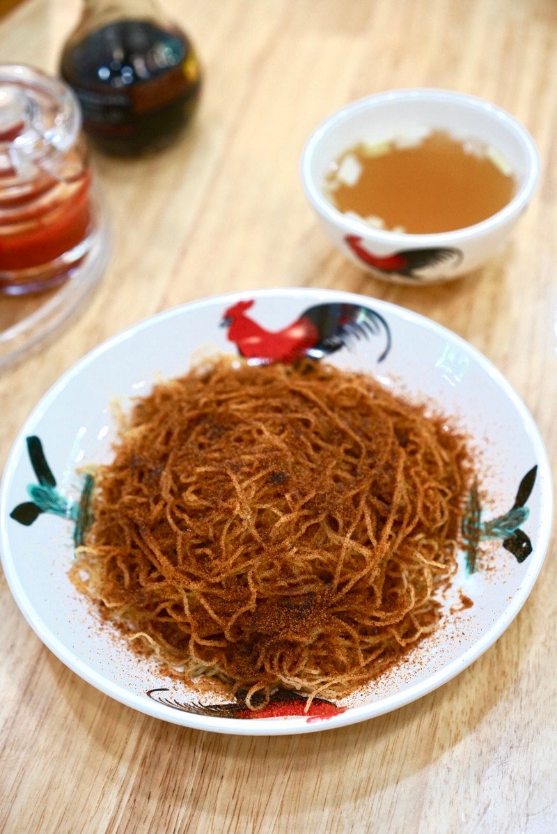 他家的云吞面同样投注了许多的心机。汤底用厚身的油地、淡水虾子、虾米、金华火腿和猪骨来熬制,每天早上3点半开始煲,足足煲上3个小时。他认为如今的鸡蛋香味并不逊色于鸭蛋,因此在做面时,他用的是鸡蛋,蛋清与蛋黄都用上。蛋清增加面的硬度,蛋黄带来香度。面条同样用高筋面,面所用的碱水,是有着上百年历史的陈村食用碱水,爽中带麦香,这是严格把控走碱时间的“成果”。至于云吞,吴锦云有自己的理解,不加鲜虾,只用猪的上胛肉。手工处理,挑除上胛肉的筋与网油,最后的成率只有六七成。猪肉全部经过手工切,一粒粒肥瘦均匀。薄薄的云吞皮,裹着精制过的猪肉,小巧玲珑,肉香皮薄。