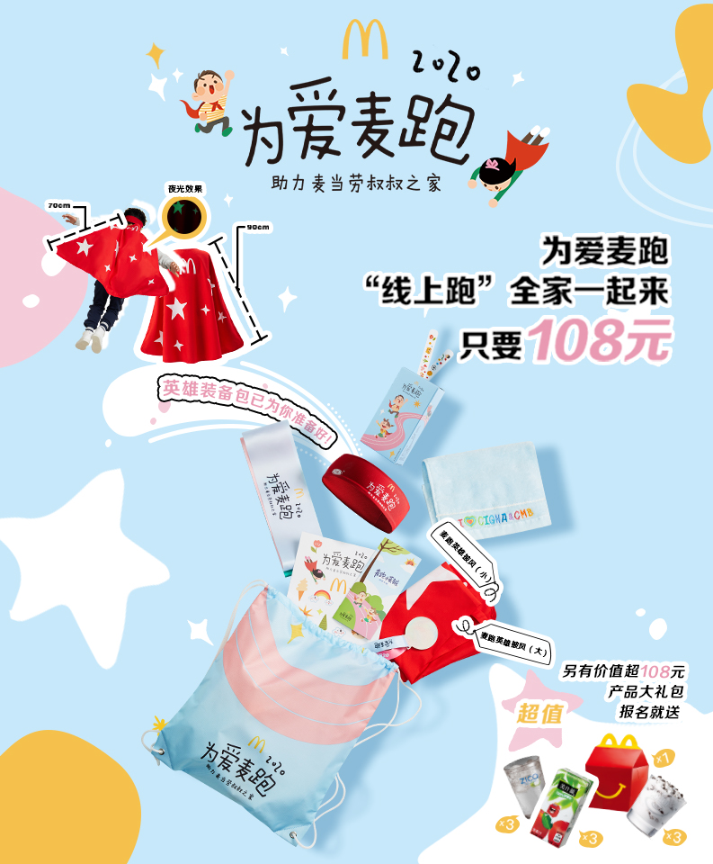 装备包的内容更是惊喜不断:有白天积聚能量、晚上发光的一大一小两件披风,有小英雄互动游戏任务盒和跑步冲刺带等,以及价值超百元麦当劳产品电子兑换券。装备包里,还有特别使用回收的开心乐园餐玩具为原料制成的奖牌,让每位“麦跑小英雄”体验到欢乐、环保和公益。