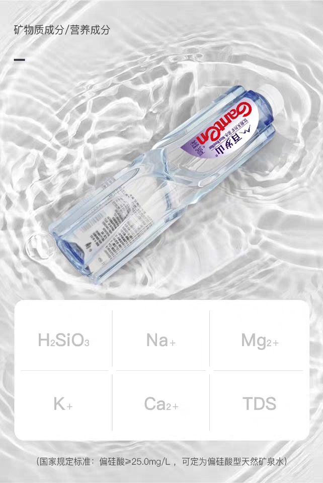 经小编了解,百岁山天然矿泉水是采自于地下深层岩石裂隙中,从不使用湖水、河水、水库水等地表水。而且,百岁山的矿泉水源具有《采矿许可证》,属于国家液体矿产,如同金矿银矿。一经开采可直接饮用,水源天然无污染,还含有高偏硅酸,以及钾、钠、钙、镁等丰富矿物质及微量元素。正因为这样优质珍贵的矿泉水源,才成就了水中贵族独一无二的品质。