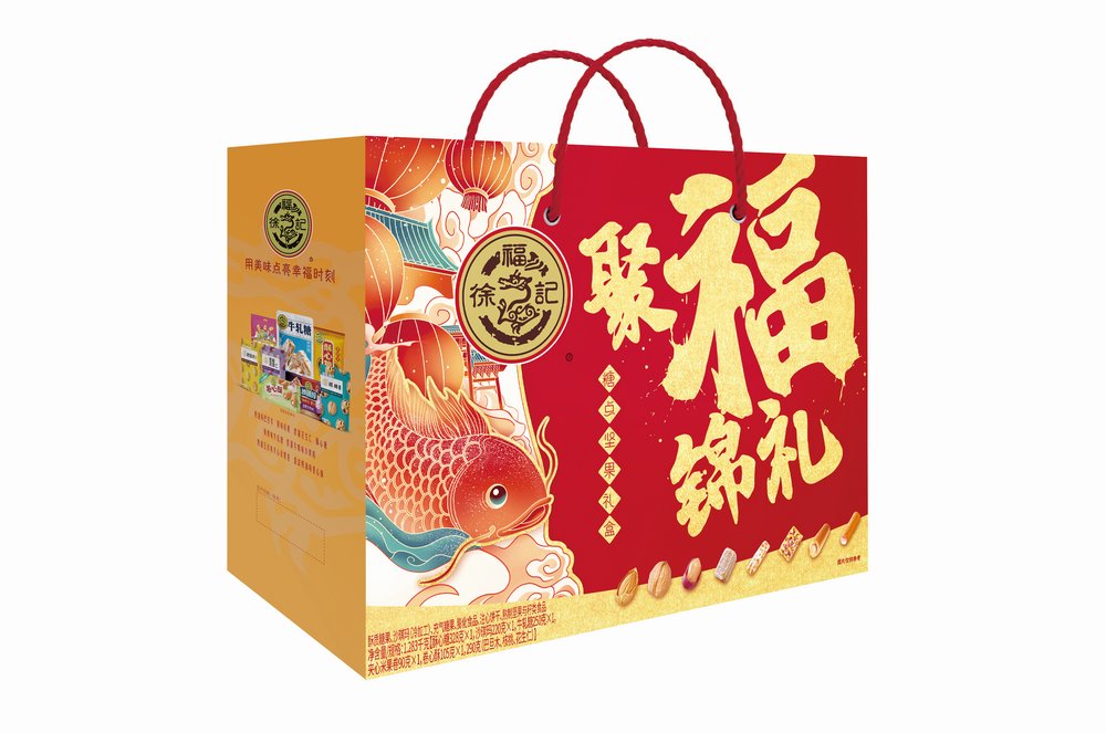 根据2018-2019天猫坚果炒货细分品类市场规模占比及增速数据显示,优质精选坚果消费量每年以20%的速度增长 (数据来源自 CBND ata第一财经业数据中心)。近几年坚果产品在市场已相对饱和,单纯的坚果产品在市场上已屡见不鲜。如何能够杀出重围,以独特的方式出圈?根据市场观察,相比独立的坚果产品,混搭的多品类礼箱更容易让消费者喜欢,徐福记结合自身多品类的优势,推出坚果混搭的9款综合礼盒,5种坚果产品,包括巴旦木、蟹黄味瓜子仁、蟹黄味蚕豆、原味核桃、紫薯花生,混合搭配徐福记经典的糖点零食,并有不同的价格,可一提满足全家人的多种食用需求。产品包装统一用具有吉祥寓意的名称,聚“福”锦礼,过年好兆头。
