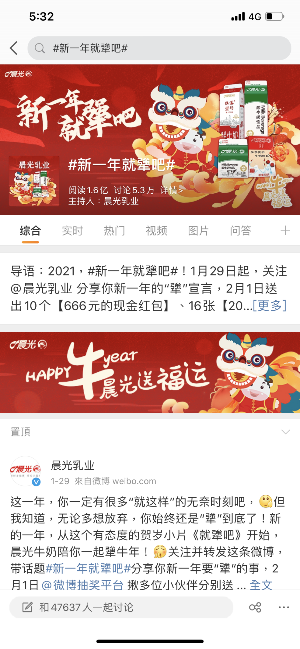 与此同时,@晨光牛奶发起“犟到底”话题分享抽奖活动,以“666元红包”等“牛气”奖品刺激用户参与话题讨论。最终,话题 #新一年就犟吧#登陆微博热搜榜第6位,仅两日吸引1.5万人参与讨论,话题阅读量突破1.6亿。