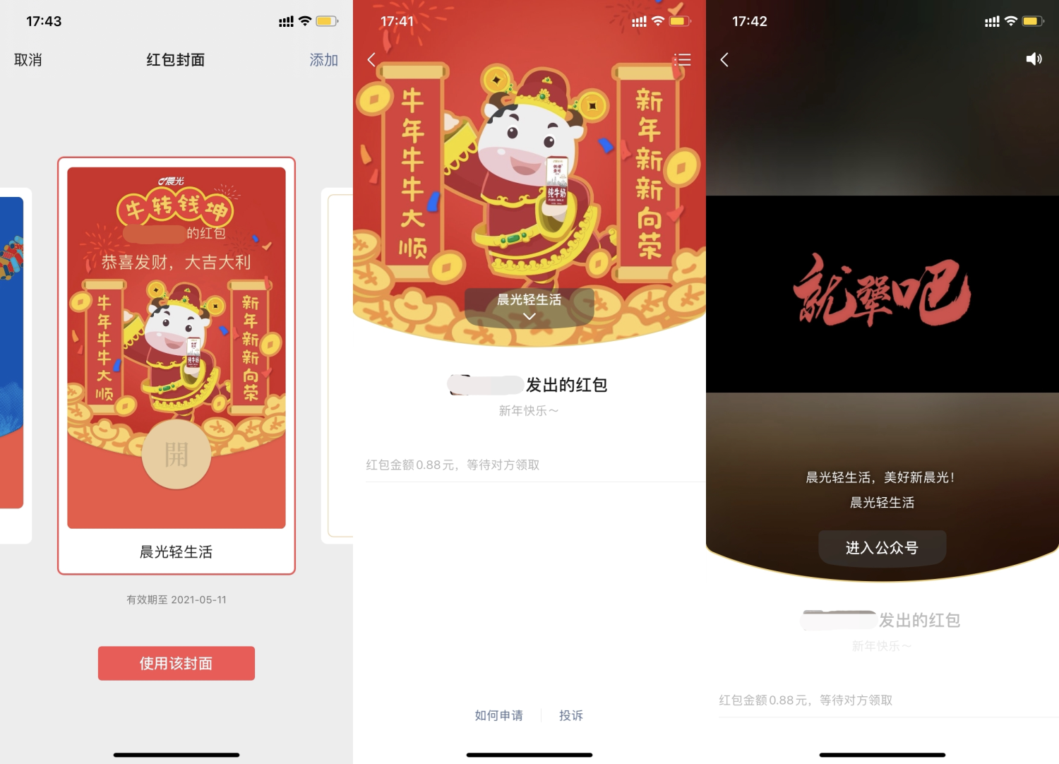 2021年的春节线上定制红包封面成为网民热议的话题,相较于往年的春节红包,各具特色、风格不一的红包封面无疑是今年最明显的特色了。晨光乳业也为此做出了尝试,针对晨光牛奶用户和粉丝大胆设计,将憨态可掬的品牌IP放置在封面C位。无疑,这波宠粉操作有助晨光牛奶获得更多粉丝的点赞,增强用户粘度。