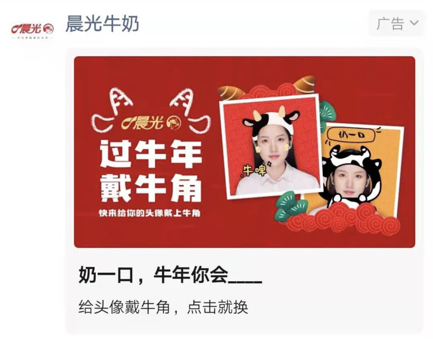 春节,正是各大品牌争相出招时刻,如何在一众营销活动中突出重围吸引用户关注?洞察到用户在春节期间“换个喜庆头像”以及“发红包”的强需求,晨光乳业趣味游戏H5“换个头像犟牛年”和“定制红包”于除夕前上线,邀请用户为现有微信头像戴上“牛角”。牛角头像不仅可以用于微信,也可用于其他社交平台。