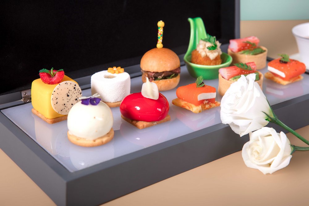 酒店饼房厨师长赵伟融汇创新,选用当季新鲜花材与鲜爽水果,打造了数款意趣多彩的甜品佳作:茉莉百香果椰子蛋糕,茉莉花的清新邂逅酸甜的百香果与香浓的椰子,细品层叠交融的奇妙滋味;洛神花玫瑰蛋糕,玫瑰的馥郁悠长糅合洛神花的明快艳丽,一口便是春天;青柠春茶蛋糕,别具创意地将青柠和碧螺春茶融合,酸爽口感里裹挟着若隐若无的茶香;桂花米酒蛋糕,当桂花飘进米酒,花香伴着微醺,细腻绵柔,在唇齿间琢磨品味;水果“炸弹”,轻轻一敲,冰爽可口的水果倾泻而出,果香四溢,是视觉和味觉的盛宴。咸点也是不可错过的味蕾礼赏:肉质鲜嫩的蟹肉和清新爽口的牛油果巧妙融合,呈现海陆鲜甜交汇的美妙体验;细腻鲜美的三文鱼,配上丝滑浓郁的奶油芝士和诱人的鱼子酱,是一场舌尖的奢享。随下午茶搭配的新鲜烘焙司康饼,花香果香四溢的花茶,更增添午后的曼妙意趣。