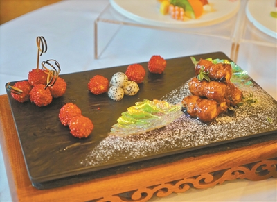 广东点心以“四大天王”享誉世界,“笋尖鲜虾饺”与“蜜汁叉烧包”更是人们“饮茶”风俗的必点。据介绍,红棉华宴呈现的点心“玉液叉烧包”,是粤菜师傅们为表达对陈勋等一辈点心泰斗的尊重和敬意而设。粤点技艺中的面塑,被誉为“南派”,尤以岭南时果为著名,红棉华宴的压轴出品便是“面塑岭南果”,将岭南时果运用面塑技艺呈现出来。
