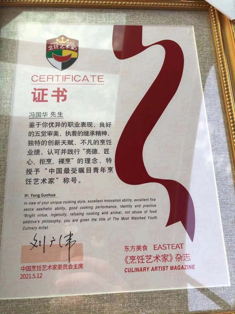 同时记者获悉,在近期举行的“首届中国餐饮品牌集群大会暨第三届中国餐饮产业品牌年会”上,农耕记创始人、首席产品官、头号好吃鬼冯国华荣获东方美食2021年“中国最受瞩目青年烹饪艺术家”称号。该奖项在业内享有“中国餐饮行业奥斯卡”称号,候选人必需具有一定的烹饪艺术创造能力和烹饪艺术鉴赏能力,并愿意践行“亮德、匠心、拒烹、裸烹”价值观,且乐于传承、分享、交流菜品技术。