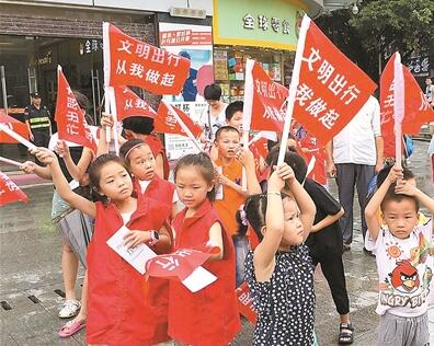 福永街道白石厦社区妇联巾帼志愿者倡导文明出行。