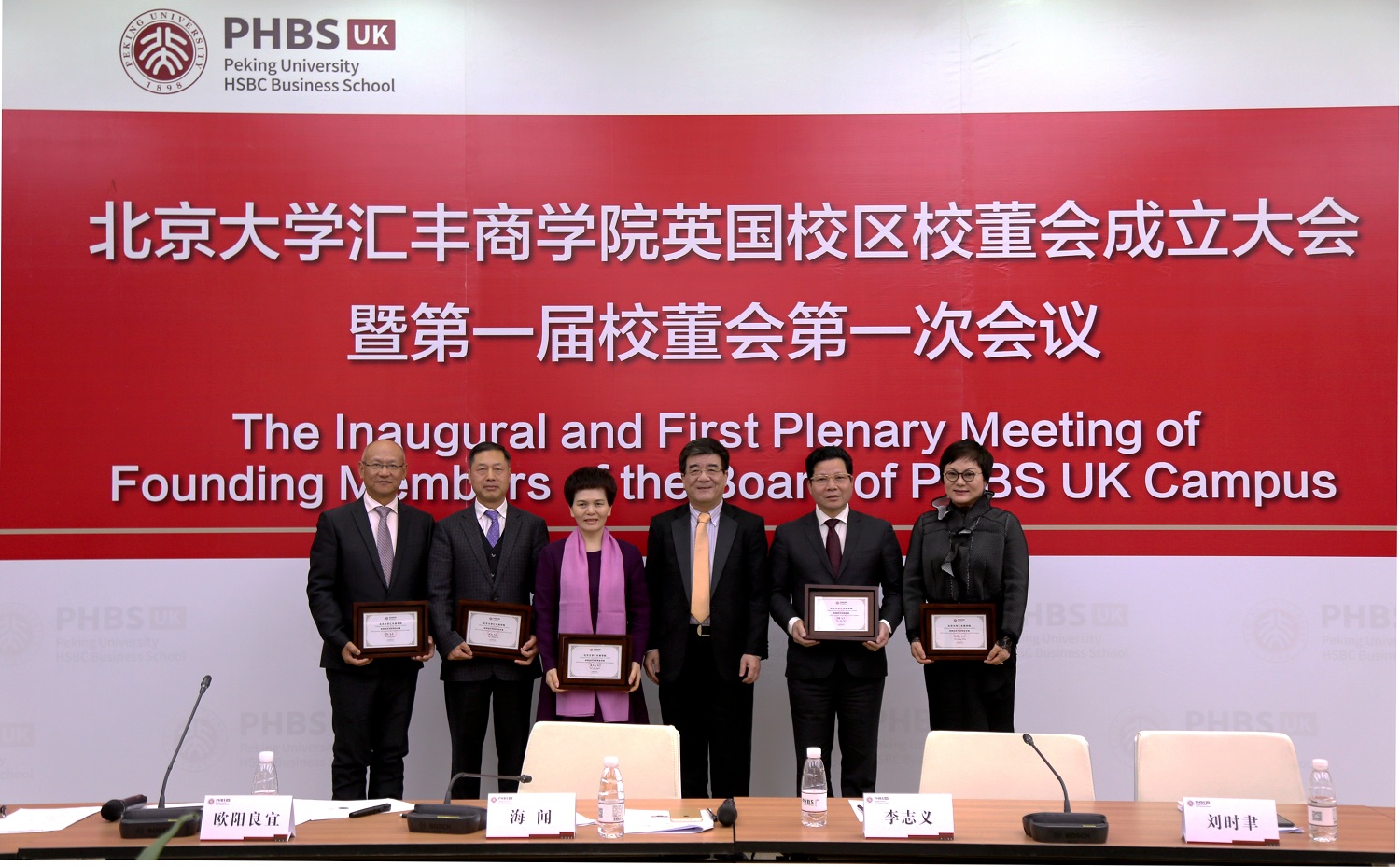 会议一致通过了《北京大学汇丰商学院英国校区校董会章程》。海闻院长向全体创始校董赠送了纪念品并合影留念。