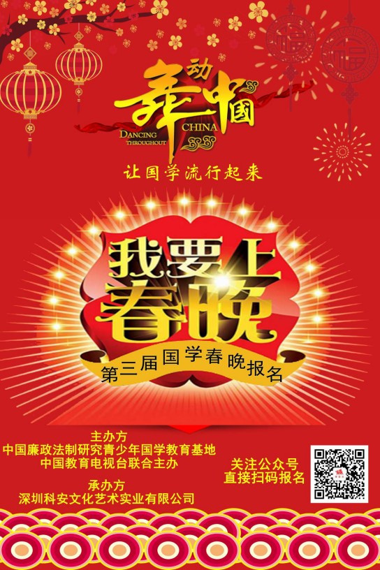 2019年第三届国学春晚由青少年国学教育基地与中国教育电视台联合主办,本次春晚打破以往以晚会为主导的筹办模式,更注重国学文化的推广及全民国学才艺的选拔。首次以主办方的报道与宣传规模在全国范围内进行海选。以“舞动中国”为主题在全国范围内进行强势推广,发出中国国学文化领域的最强音!在长达4个多月的宣传活动期间,将不间断运用活动背景、辐射人群、媒体资源、赛事平台及网络优势等方式弘扬国学。