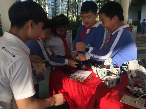 在活动现场,不少智能科技迷正被爱汇百变教育科技有限公司的EV3编程机器人高尔夫、EV3编程机器人幸运大转盘、EV3编程机器人障碍大闯关、电磁感应千人震等系列体验活动,通过亲身体验,同学们收获了LEGO仿真机械结构及图形化编程、电动发电、电磁感应、电路等科普知识。