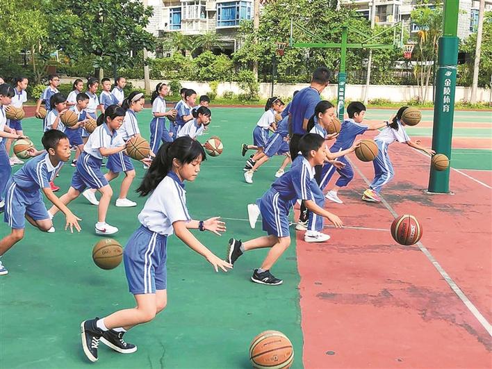 6月的天空在大雨过后碧蓝如洗。篮球场上,在体育教师有节奏的口令下,孩子们展示出拿手的篮球“绝技”,双手击掌抛接球、胯下拍球、行进间运球等让人眼花缭乱。