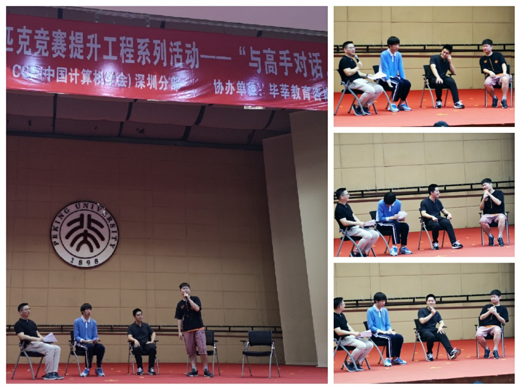 本次活动除了邀请周楷文同学亲临现场之外,还邀请了雅礼中学正高级教师,为雅礼贡献了9块IOI金牌的朱全民老师;北京大学深圳研究生院计算机专业雷凯副教授;雅礼中学毕业,通过信息学竞赛保送到北京大学信息科学与技术学院计算机专业就读本科以及研究生的章嘉晨同学,国际大学生信息学竞赛(ICPC)区域赛金奖、报送北京大学深圳研究生院就读计算机专业的陈锐彪同学。
