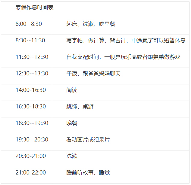 为了不大眼瞪小眼,我和孩子一起制定了一张计划表如下: