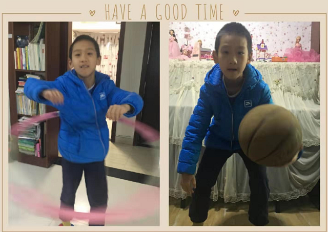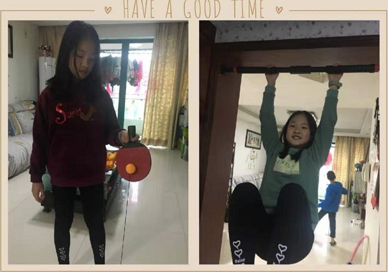 当然运动也是必不可少的啦,要使身体有较强的抵抗力,我们除了按时作息,还要运动起来,所以每天都有运动项目,跳绳、呼拉圈、单杠、室内乒乓球轮翻上阵,篮球也拍了下,但极少,为了不能给楼下邻居带来噪音,弟弟已经极力控制看书拍球时间了。还有姐姐还做了有意义的事情,给我们一线的医生和患病的人儿录了鼓励的视频。