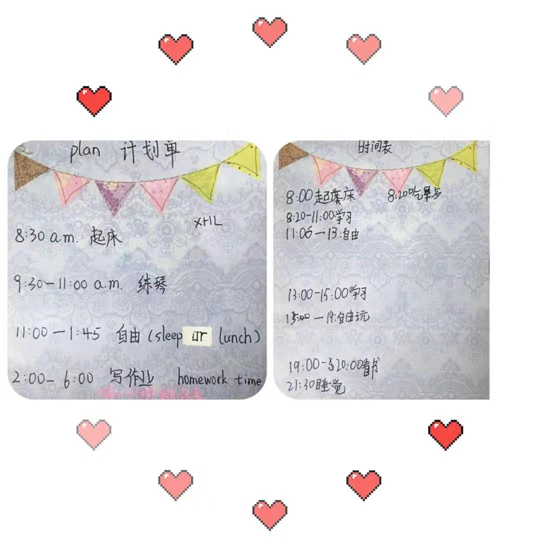 因为新冠疫情,我们在初三就从老家湖南赶回了深圳,想着就算是要隔离,我们也能提前自行先隔离,到家后将从老家过来的所有衣物第一天就全部清洗,将家中消毒清洁,整整忙了一天。当天晚上我们便与孩子们开了一个家庭会议,告知两个孩子我们将要面对的问题,不能出家门,要好好待在家中,但是除了玩耍、电视,我们需要合理安排学习的时间,我们让孩子们自己做了一份自己的时间表。