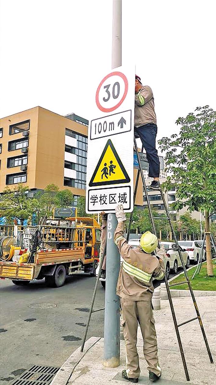 交通设施维护工人在龙华区龙腾学校周边道路安装提示牌。
